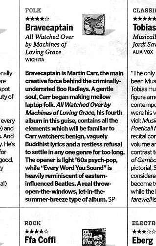Machines do what we want. We design them, we control them, they're our slaves. They're just machines, right? Wrong. The machines are revolting; we're losing control. This album tracks Bravecaptain's (aka Martin Carr) efforts to control machines. At times, Carr had the upper hand. But then things start to change... Despite a strong start and a title track which rocks (albeit electronically), 'All Watched Over...' is a patchy affair. Carr is often dangerously close to losing control, not just of the machines, but also the listener. The ridiculous 'Little Giant' and directionless 'Flow Machines' prove the machines really have taken over. You're left thinking that this project (to record primarily electronically) was a good idea down the pub, but that, in reality, all Carr wanted to do was pick up his guitar and ROCK...