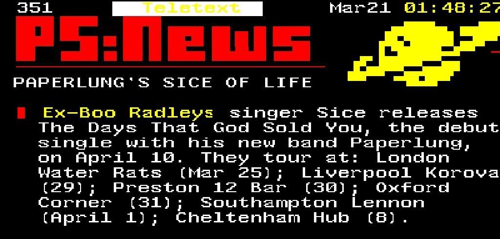 I went to see Paperlung on thursday at the Dublin Castle and they were fantastic. Sice still has the voice of an angel and the humble amiability that so many other frontmen lack, and has surrounded himself with a talented and enthusiastic young band and the songs were all well crafted gems